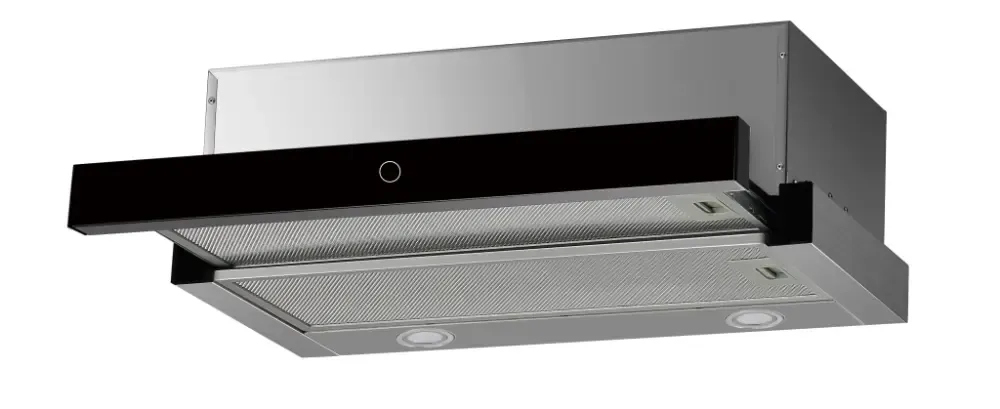 Встраиваемая вытяжка с двумя мощными моторами и современным сенсорным управлением на выдвижной панели.