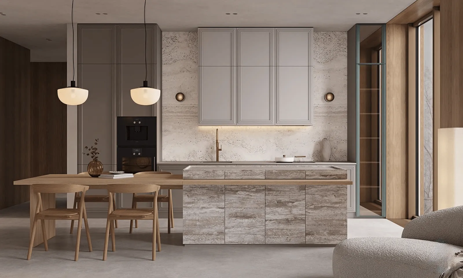 Одним из самых популярных и удачных фасадов для кухни являются фасады ЛДСП Синкрон из коллекции ЛАМБЕРТИ . Этот материал отличается прочностью, долговечностью и доступной стоимостью. К тому же, его поверхность имитирует натуральные материалы, что создает необычный и стильный вид кухонных фасадов. Покрытие синкрон полностью повторяет текстуру натурального материала, будь то мрамор или гранит. Этот эффект делает кухню более интересной и привлекательной, а также становится отличной деталью для любого стиля.