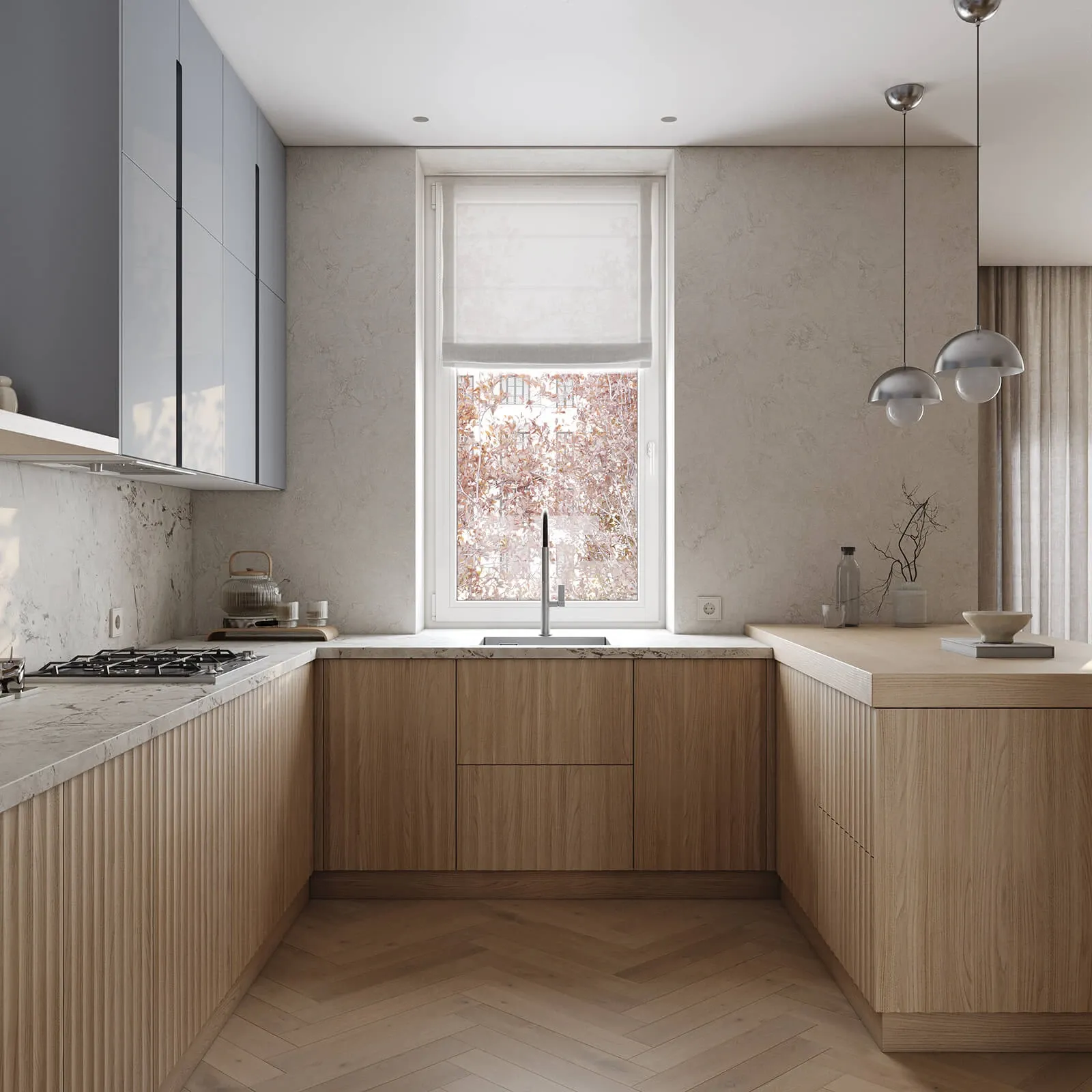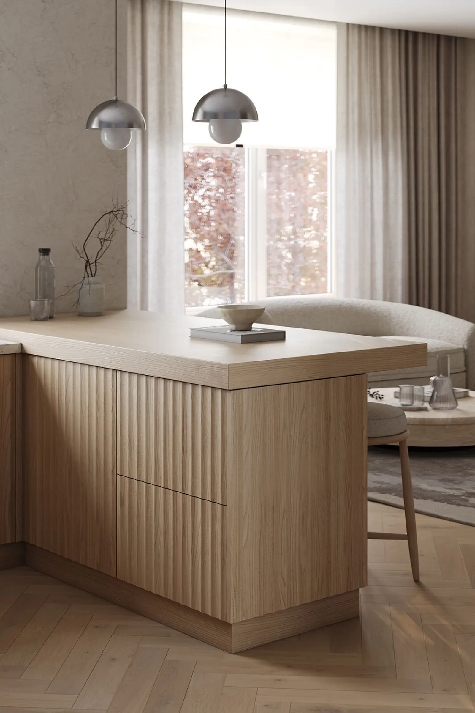 Фасады: T443 Шпон дуба, цвет #189 (воскобейц Белый) / Т622 Крашеная МДФ, цвет NCS S 2010-R90B Матовый