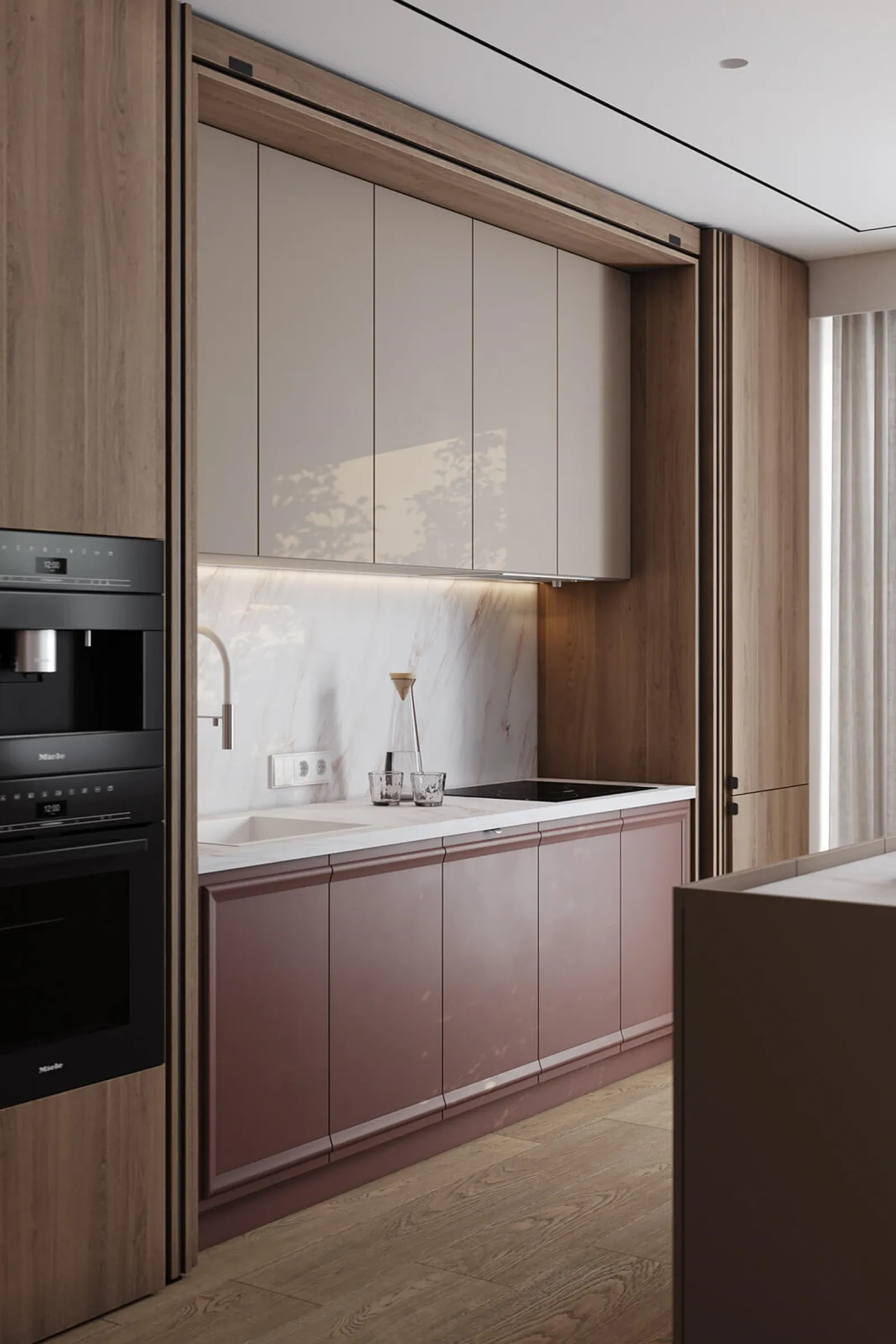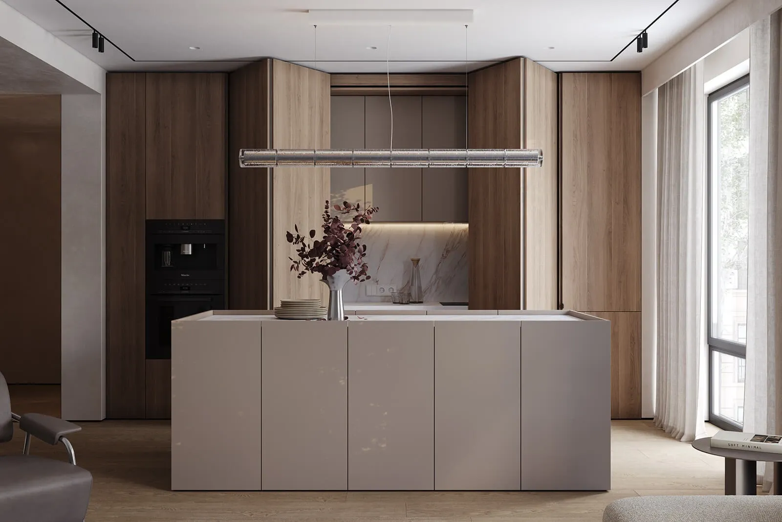 Фасады: ЛМДФ SUPRAMAT, цвет Сафари Супрамат / ЛМДФ Тимбер, декор Кунео Коричневый / Т651 Крашеная МДФ, цвет NCS S 6020-R Матовый