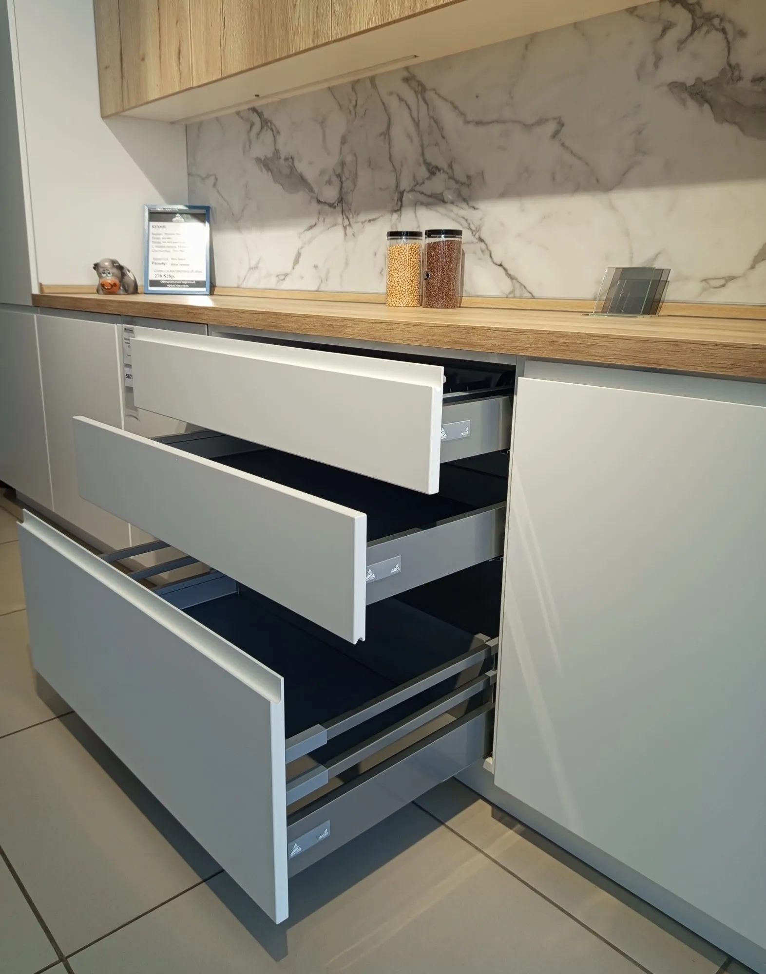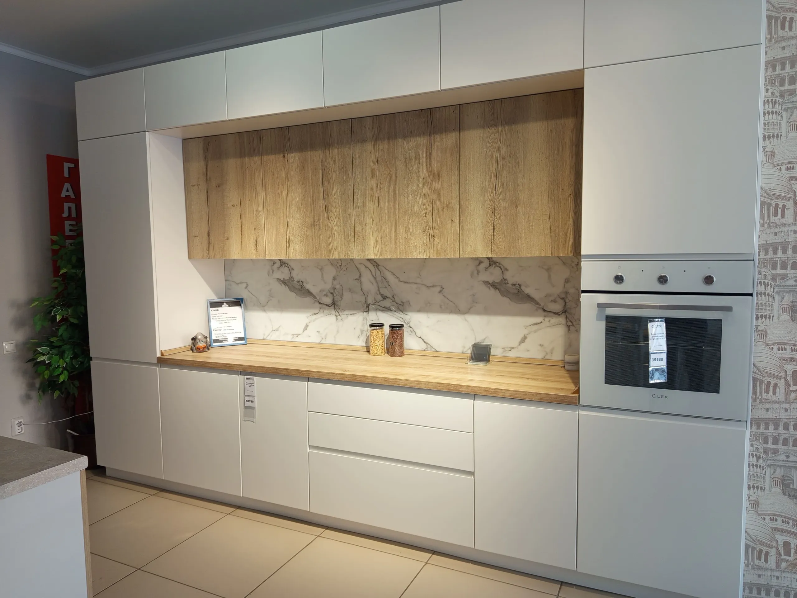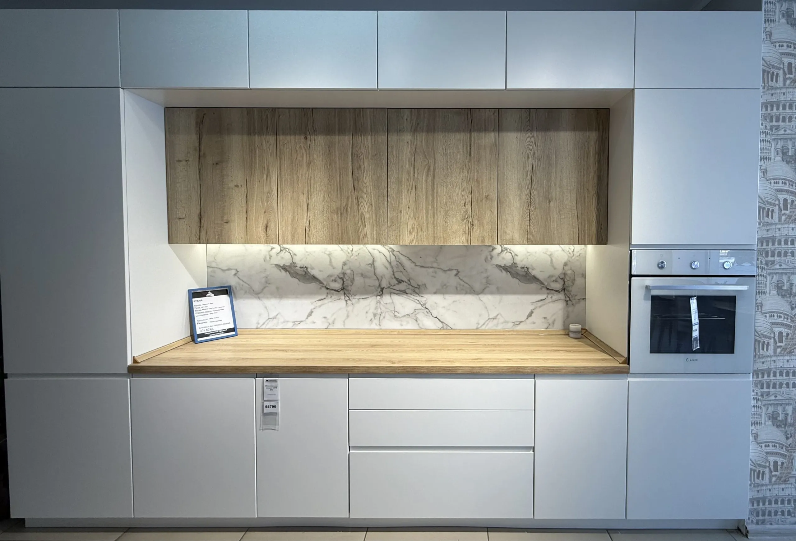 Фасад: Эмаль RAL 9016 мат/ДСП Тимбер Галифакс Каркас: ДСП 18мм Белый премиум Столешница: HPL пластик 38мм Поло Стеновая панель: МДФ 6мм Мрамор Цоколь: Пластик Белый мат Подсветка: В профиль, регулируемая Отбортовка: Пустышка + вставка Фурнитура: Подъемник AVENTOS HK-XS TipOn Blum/Сушка Rejs, хром/Повеска усиленная Camar "807"
